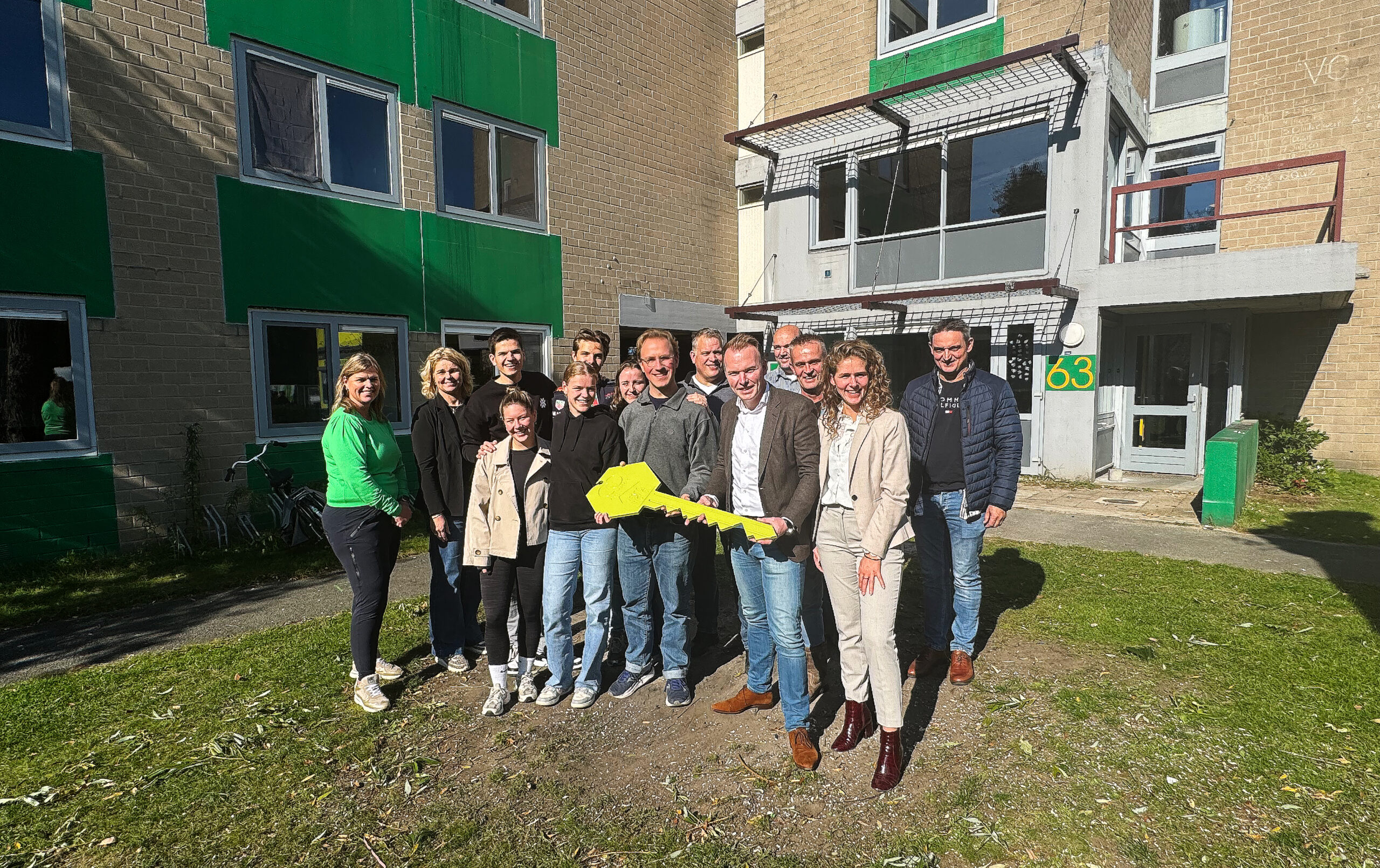 The renovation of three student housing complexes on Campuslaan at the University of Twente has officially begun. The iconic buildings in yellow, blue, and green are undergoing a major upgrade. Residents of the first building to be renovated, Campuslaan 59–65, symbolically handed over the key to Ons Verbond. This marks a special milestone, as it signals the start of renovations on the second complex type within the broader ‘Campus Upgrade’ initiative