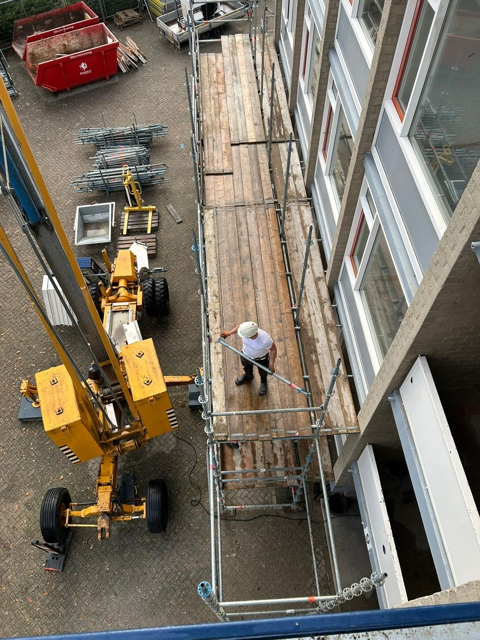 The first steps are done! Work at Calslaan 9 is now in full swing. The old bathroom and kitchen have been removed, and new, well-insulated walls have been installed. The balcony façade has also been replaced, and the scaffolding is firmly in place. Next week, we’ll continue with the roof and installations. Step by step, we’re transforming the building into a fresh, renewed home!